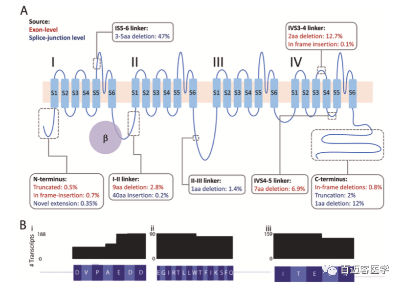 CACNA1C編碼CaV1.2 的主要成孔亞基。鈣孔由24個(gè)跨膜重復(fù)序列組成,由細(xì)胞內(nèi)環(huán)連接成4個(gè)結(jié)構(gòu)域(I-IV)(圖4A)。在我們鑒定的83個(gè)新的外顯子水平的轉(zhuǎn)錄本中,51個(gè)可能編碼功能性的CaV1.2通道?;疑娇虮硎拘碌摹⒖蚣軆?nèi)的插入和刪除的位置(值表示包含每個(gè)isoforms的reads的平均比例)。使用兩種分析方法(外顯子水平和剪切連接水平)鑒定變體的情況,外顯子水平計(jì)數(shù)用于得出豐度(紅色文本);僅使用剪接位點(diǎn)水平方法鑒定的變體用藍(lán)色文本表示。包含三個(gè)微缺失的蛋白質(zhì)異構(gòu)體的數(shù)量:(I)在I-II接頭中,(Ii)在IV4-5接頭中,以及(Iii)在IV3-4接頭中先前報(bào)道的微缺失(圖4B)。
