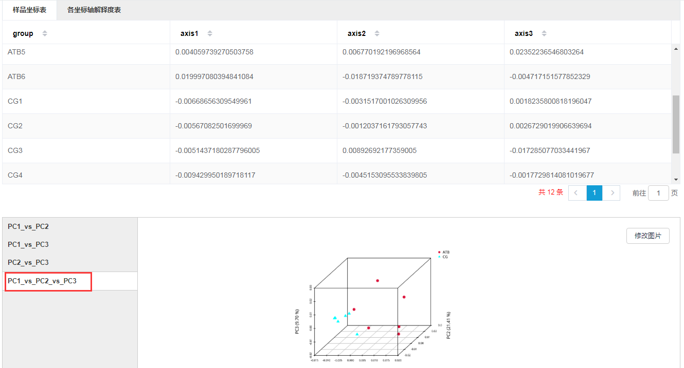 PCA/PCoA分析通常使用第一軸和第二軸的信息展示樣品或者分組之間的聚集和差異,當(dāng)?shù)谝惠S和第二軸不足以展示組間差異時(shí),我們可以通過三維圖查看前3軸對(duì)樣品間差異的影響。打開結(jié)題報(bào)告后點(diǎn)擊“Beat多樣性分析”中的PCA分析或者PCoA分析,選中樣品或者分組,提交任務(wù)后會(huì)顯示三維分析結(jié)果。