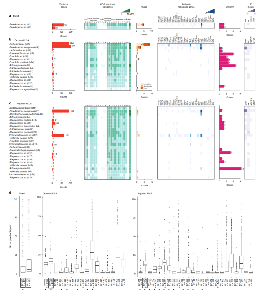 通過富集培養(yǎng)獲得的分類學(xué)多樣性的增加直接轉(zhuǎn)化為該微生物群落功能信息的增加(圖6)。富集培養(yǎng)測序在直系同源蛋白簇(COGs)、毒力基因、抗生素抗性基因、CRISPRs和次級代謝功能方面獲得更大的多樣性和功能鑒定數(shù)量。先前的研究已經(jīng)證實囊性纖維化氣道以及整個人類微生物群中存在單一物種的異質(zhì)性群體。作者通過鑒定基因單倍型來計算每個宏基因組bin的遺傳變異性(圖6d)。在一些宏基因組bins中,作者鑒定到一個一致的和少量的基因單倍型,表示這個bin代表一個單一的基因組群體(即一個菌株)。在大多數(shù)bins中,作者觀察到大量的單倍型多樣性,指示異質(zhì)性群體,即多菌株。不出所料,這些區(qū)域中每個基因的單倍型數(shù)量是多種多樣的,這表明細菌基因組內(nèi)進化壓力的已知范圍。平均而言,假單胞菌屬種中鑒定出更多的基因單倍型,富集培養(yǎng)的bins比直接測序更多。然而,直接測序鑒定了大量的普遍存在的單倍型基因離群值。Bin的完整性與平均單倍型頻率沒有相關(guān)性。