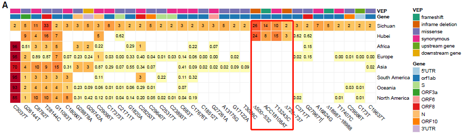對截至2020年11月9日存放在GISAID上的81391個高質量公共基因組序列進行分析,其中35個snp中有29個(82.8%)來自其他大洲;一些變異(C3037T、G26144T、C8782T、T28144C、G11083T和C18060T)在歐洲、非洲、大洋洲和美國流行,表明大多數snp已經在世界范圍內流行。與武漢人群的比較顯示,四川和武漢都存在另外四種變體,這些復發(fā)型包括三個Indels:Δ500-532, ACC18108AT和Δ729-737;一個SNP:T13243C(圖2A),表明這些變異可能是從武漢輸入的,與四川患者的旅行記錄一致。
