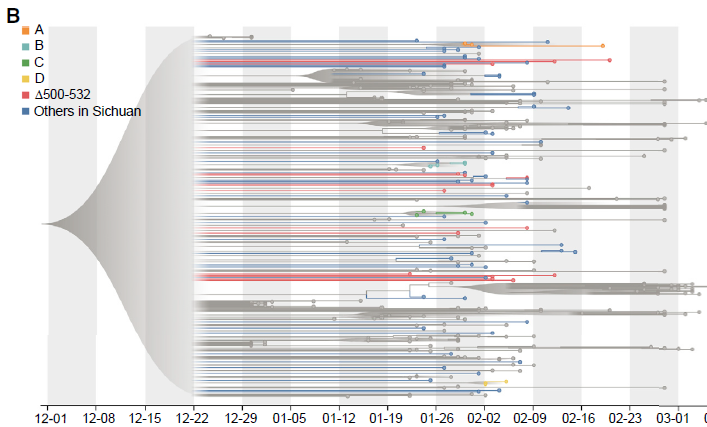 值得注意的是,在Nsp1編碼區(qū)有兩個缺失,Δ500-532和Δ729-737,在四川觀察到23例(26%)和2例(2.2%);在武漢觀察到39例(24%)和4例(3%)。對Δ500-532的基因組進行了研究,發(fā)現它在系統(tǒng)發(fā)育樹的不同簇中分布稀疏(圖2B)。結果表明Δ500-532發(fā)生在多個城市,并可能從武漢多次輸入,這與缺失Δ500-532的四川患者中有83.3%的人有去過武漢的旅行史相一致。