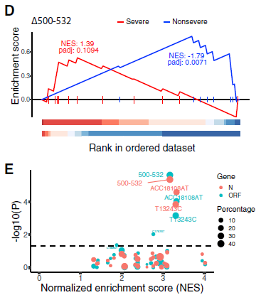 采用類似GSEA的分析方法,來鑒定一個突變體是否富集嚴重/非嚴重的臨床表型。發(fā)現Δ500-532與ESR等嚴重相關表型呈負相關?;谟?沒有某種變異類型,將病例分為兩組,發(fā)現感染Δ500 -532病毒的患者在所有檢測的35種變異中Ct值最高(圖3E)。