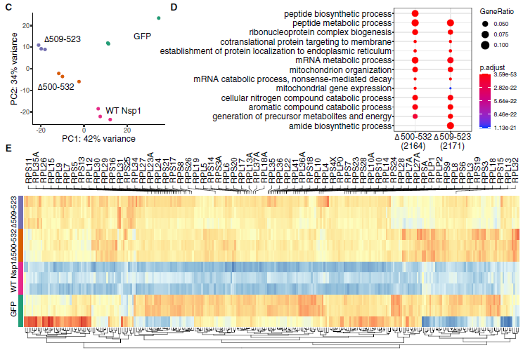 GO富集分析發(fā)現,與WT Nsp1相比,突變體Nsp1在生“肽的生物合成/代謝過程”,“核糖核蛋白復合生物發(fā)生”,“靶向膜/內質網的蛋白質”,“mRNA代謝過程”和“無意義介導的衰變”等方面顯著上調,符合報道的SARS-CoV-2 Nsp1的功能(圖5D)。