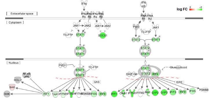 圖6G 與表達WT Nsp1的A549細胞相比,Δ500-532突變體中干擾素信號通路顯著下調(綠色表示下調,紅色表示上調)