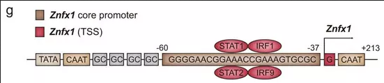 為了確定哪些核苷酸和區(qū)域Znfx1轉(zhuǎn)錄中很重要,使用promoter 2.0( http://www.cbs.dtu.dk/services/promoter/)、JASPAR(http://jaspar.genereg.net/)和CpGplot(http://www.ebi.ac.uk/Tools/seqstats/emboss_cpgplot/)進(jìn)行識(shí)別,其中包含TATA框、GC框和CAAT框的Znfx1的-1,064~+63之間的區(qū)域,是啟動(dòng)子。對(duì)轉(zhuǎn)錄因子結(jié)合位點(diǎn)的進(jìn)一步分析表明,Znfx1的啟動(dòng)子在相對(duì)集中和重疊的區(qū)域中包含STAT1、STAT2、IRF1和IRF9結(jié)合基序?;谶@些分析,構(gòu)建了一個(gè)Znfx1啟動(dòng)子報(bào)告基因載體,包含?1,064~+63之間的區(qū)域,以及一個(gè)突變的報(bào)告基因構(gòu)建體,其中缺失了STAT1、STAT2、IRF1和IRF9結(jié)合motif。接下來,STAT1,STAT2,IRF1或IRF9過表達(dá)質(zhì)粒和2個(gè)報(bào)告基因載體轉(zhuǎn)染293T細(xì)胞,報(bào)告基因分析表明,在STAT1、STAT2、IRF1或IRF9存在的情況下,報(bào)告基因的表達(dá)可以由Znfx1啟動(dòng)子誘導(dǎo),而不能由缺少轉(zhuǎn)錄因子結(jié)合位點(diǎn)的啟動(dòng)子載體誘導(dǎo)(圖1l)??偠灾?,ZNFX1是一個(gè)ISG,其病毒感染后的上調(diào)取決于JAK1-STAT1級(jí)聯(lián)反應(yīng)。