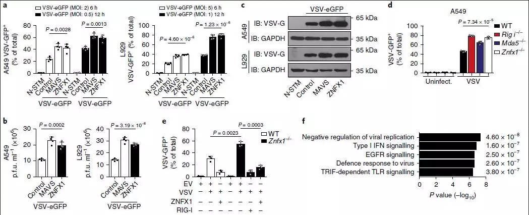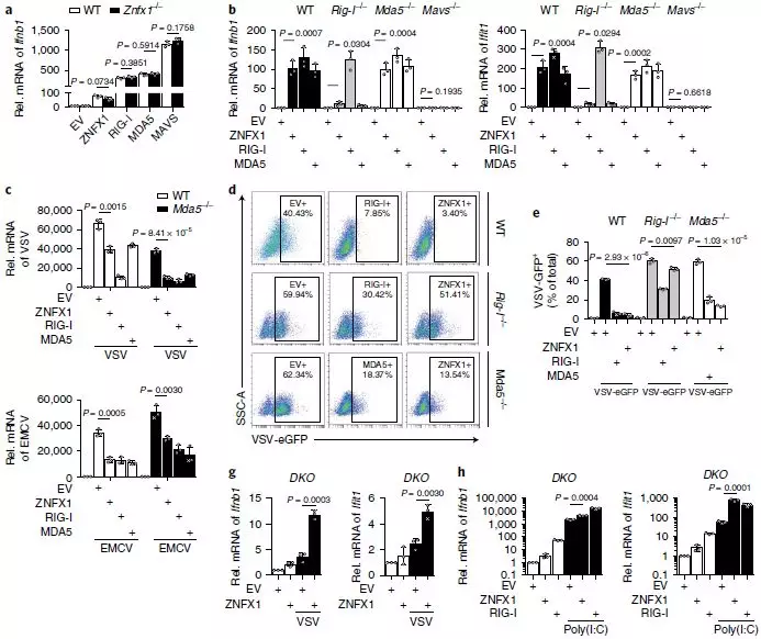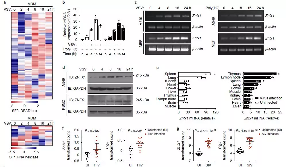 為了更深入地了解ZNFX1在抗病毒應(yīng)答中的作用,進(jìn)行了qRT-PCR或免疫印跡分析,以了解VSV感染或干擾素誘導(dǎo)劑聚肌胞苷酸(poly(I:C))刺激A549細(xì)胞、外周血單個(gè)核細(xì)胞(PBMC)或小鼠胚胎成纖維細(xì)胞(MEF)細(xì)胞后ZNFX1的表達(dá)上調(diào)(圖1b–d)。qRT-PCR也證實(shí)了靜脈注射VSV后小鼠脾臟和肺中Znfx1的豐度上調(diào)(包括胸腺、淋巴結(jié)脾臟和肺)(圖1e)。作者還對(duì)先前收集的芯片數(shù)據(jù)集(GDS4231/4214/1271/3210/6082/6063)進(jìn)行了統(tǒng)計(jì)分析,發(fā)現(xiàn)與健康對(duì)照相比,在HIV感染患者和猿猴免疫缺陷病毒(SIV)引起的腦炎猴子中,Znfx1的RNA水平明顯更高(圖1f,g)。此外,在不同的細(xì)胞類型(包括巨噬細(xì)胞、樹突狀細(xì)胞和上皮細(xì)胞)中感染病毒后,Znfx1的轉(zhuǎn)錄顯著增加。這些數(shù)據(jù)都表明ZNFX1可能是抗病毒分子。