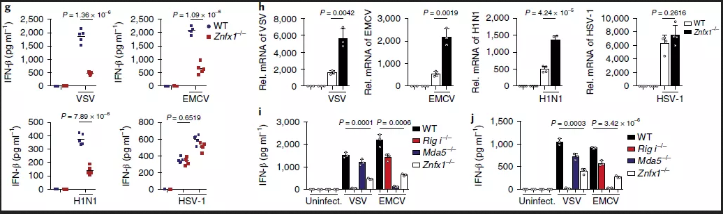為了研究ZNFX1在體內(nèi)的生理作用,使用CRISPR/Cas系統(tǒng)生成了Znfx1-/-C57BL/6J小鼠。Znfx1-/-小鼠存活,沒有明顯的生理或行為異常。在這項(xiàng)研究中使用了六至八周大的小鼠。首先,分離野生型和Znfx1-/-小鼠的BMDM并用VSV、EMCV、H1N1或HSV-1感染,與野生型相比,Znfx1-/-BMDM的IFN-α或IFN-β分泌較低。RNA病毒感染后,包括VSV、EMCV和H1N1,但不包括HSV-1(圖2g),Znfx1-/-BMDM中檢測(cè)到較高的病毒mRNA水平,但在HSV-1感染的細(xì)胞中未檢測(cè)到較高的病毒mRNA水平(圖2h)。與野生型相比,Znfx1-/- MEF和A549細(xì)胞在RNA病毒感染VSV和EMCV后表現(xiàn)出較低的IFN-β分泌(圖2i,j)。
