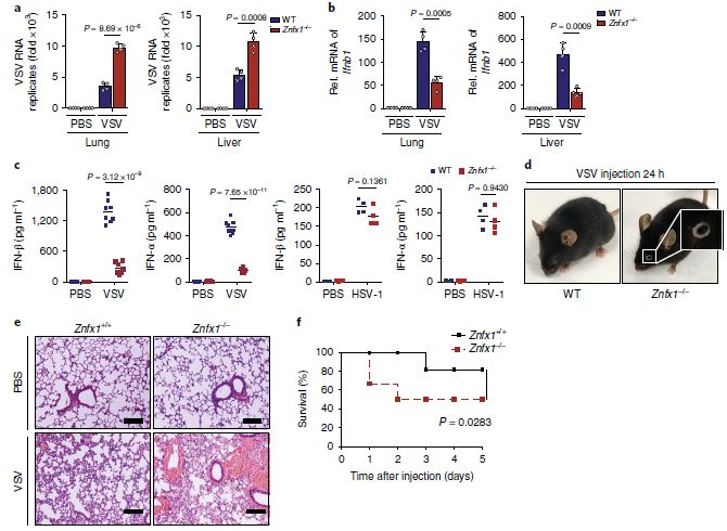 ZNFX1在宿主體內(nèi)對(duì)抗病毒感染的防御中的重要性:通過尾靜脈向野生型和Znfx1-/-小鼠注射了VSV。與野生型小鼠相比,Znfx1-/-小鼠的肺和肝中的VSV復(fù)制增強(qiáng)了(圖3a),隨著肺和肝中Ifnb1表達(dá)的減少,在Znfx1-/-小鼠中血清中IFN-α和IFN-β的分泌降低(圖3b,c)。而HSV-1感染后,Znfx1-/-和野生型小鼠之間血清中的IFN-α和IFN-β沒有差異(圖3c)。有趣的是,VSV感染一天后,Znfx1-/-小鼠中有80%患有結(jié)膜炎,這是VSV感染的早期癥狀(圖3d)。另外,觀察到VSV感染后炎性細(xì)胞更多地滲透到Znfx1-/-小鼠的肺中(圖3e),并且Znfx1-/-小鼠在存活試驗(yàn)中對(duì)VSV感染的抵抗力較弱(圖3f)。這些數(shù)據(jù)表明,Znfx1缺乏后體內(nèi)產(chǎn)生較少的I型IFN,削弱了針對(duì)RNA病毒感染的先天免疫反應(yīng)??傊?,ZNFX1專門針對(duì)RNA病毒發(fā)揮其抗病毒特性。