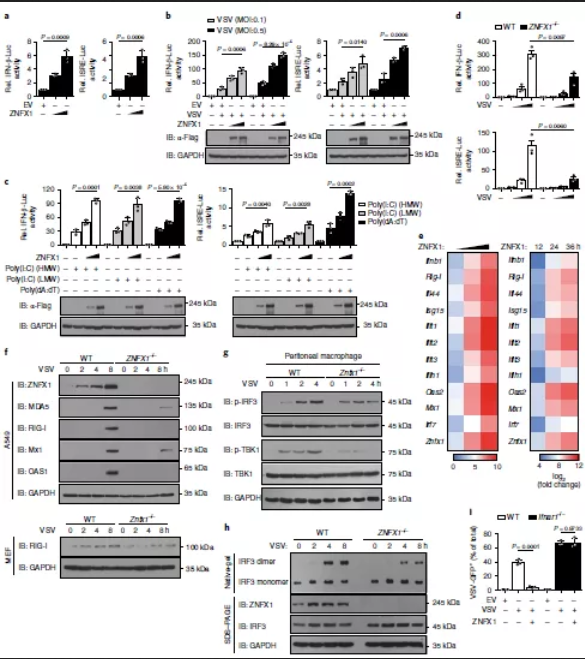 為了研究ZNFX1在IFN信號(hào)傳導(dǎo)中的作用,通過ZNFX1過表達(dá)質(zhì)粒和Ifnb1-reporter或IFN刺激的應(yīng)答元件(ISRE)報(bào)告質(zhì)粒瞬時(shí)轉(zhuǎn)染A549細(xì)胞進(jìn)行螢光素酶報(bào)告基因分析,然后進(jìn)行或不進(jìn)行VSV感染。結(jié)果表明,ZNFX1的過表達(dá)輕微激活了Ifnb1啟動(dòng)子和ISRE報(bào)告基因(圖4a)。此外,ZNFX1以劑量依賴的方式顯著增強(qiáng)了由VSV、2種類型的poly(I:C)或poly(dA:dT)觸發(fā)的Ifnb1啟動(dòng)子激活(圖4b,c)。相反,敲除Znfx1可降低VSV誘導(dǎo)的293T細(xì)胞中Ifnb1報(bào)告基因和ISRE報(bào)告基因的激活(圖4d)。Ifnb1和ISGs的轉(zhuǎn)錄以劑量和時(shí)間依賴性的方式誘導(dǎo)(圖4e),當(dāng)ZNFX1在A549細(xì)胞中過表達(dá)時(shí)隨著劑量和時(shí)間增強(qiáng)反之敲除ZNFX1則降低。而與野生型細(xì)胞相比,Znfx1-/-A549和MEF細(xì)胞中ISG蛋白表達(dá)量分別減少(圖4f)。VSV感染后Znfx1-/-巨噬細(xì)胞中TBK1和IRF3的磷酸化低于野生型巨噬細(xì)胞(圖4g)。在VSV感染的Znfx1-/-293T細(xì)胞中,IRF3的二聚化也低于野生型細(xì)胞(圖4h)。野生型A549細(xì)胞中觀察到了VSV的限制性復(fù)制,但在Ifnar1-/-A549細(xì)胞中未觀察到(圖4i)。所有這些數(shù)據(jù)表明,ZNFX1通過誘導(dǎo)I型IFN的產(chǎn)生而參與抗病毒免疫反應(yīng),其抗病毒特性也取決于IFN信號(hào)傳導(dǎo)。