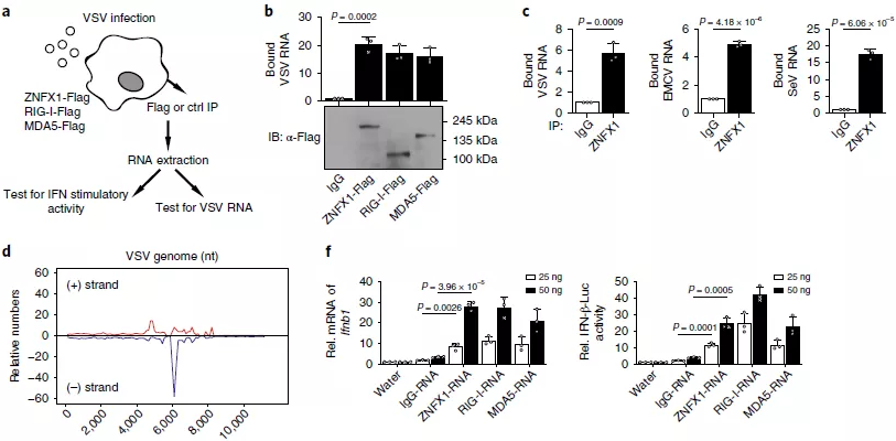 屬于RNA解旋酶SF2的許多基因被鑒定為結(jié)合病毒RNA的RNA病毒傳感器,因此假設(shè)屬于SF1的ZNFX1也可能作為RNA傳感器結(jié)合病毒RNA。為證實(shí)這一假設(shè),首先在293T細(xì)胞中過表達(dá)ZNFX1,然后進(jìn)行pulldown和qRT-PCR分析以確定ZNFX1與VSV-RNA的高結(jié)合能力(圖5a,b)。也檢測(cè)了內(nèi)源性ZNFX1與A549細(xì)胞中的VSV,EMCV和仙臺(tái)病毒(SeV)RNA的結(jié)合能力(圖5c)。通過用抗內(nèi)源性ZNFX1的抗體從免疫沉淀物中分離RNA來進(jìn)行RNA免疫沉淀(RIP)測(cè)序分析,將ZNFX1相關(guān)的RNA比對(duì)到VSV基因組(圖5d),優(yōu)先定位于約6,000-8,000 nt的VSV片段(圖5e)。值得注意的是,當(dāng)與ZNFX1相關(guān)的RNA轉(zhuǎn)染到A549細(xì)胞中時(shí),通過qRT-PCR和熒光素酶活性分析觀察到了Ifnb1的誘導(dǎo)轉(zhuǎn)錄和基于Ifnb1啟動(dòng)子的報(bào)告基因的誘導(dǎo)表達(dá)(圖5f)。