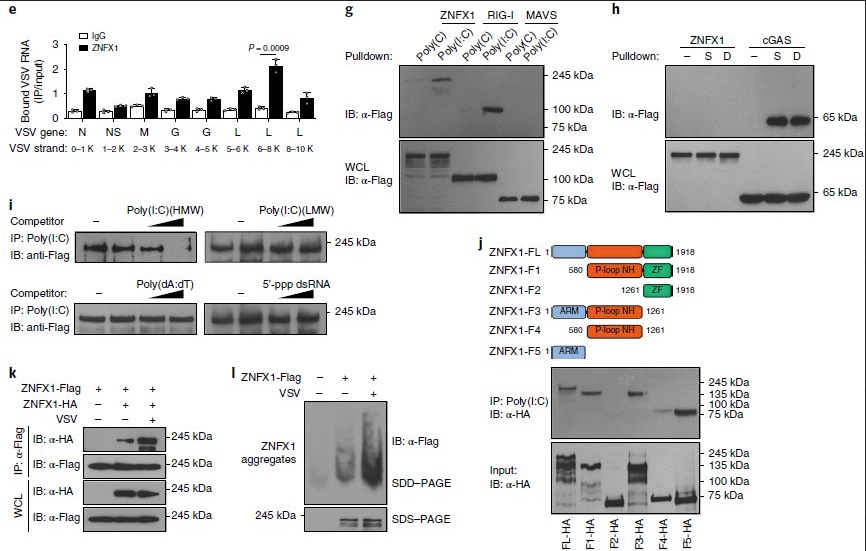 為了進(jìn)一步評(píng)估與ZNFX1結(jié)合的病毒RNA的性質(zhì),首先將核酸類似物連接的磁珠與經(jīng)Flag標(biāo)記的ZNFX1、RIG-I或MAVS過表達(dá)的293T細(xì)胞裂解液一起孵育,并進(jìn)行了pulldown試驗(yàn)以顯示ZNFX1和RIG-I蛋白與poly(I:C)結(jié)合,但不與poly(C)結(jié)合(圖5g)。cGAS而非ZNFX1結(jié)合單鏈和雙鏈DNA(ISD,一個(gè)45 bp的雙鏈DNA;圖5h)。競(jìng)爭(zhēng)實(shí)驗(yàn)顯示ZNFX1蛋白與HMW poly(I:C)優(yōu)先結(jié)合,而不是與LMW poly(I:C)、poly(dA:dT)或5’pppdsRNA優(yōu)先結(jié)合(圖5i)。為了找到ZNFX1的poly(I:C)結(jié)合位點(diǎn),準(zhǔn)備了ZNFX1的截短版本并進(jìn)行了poly(I:C) pulldown實(shí)驗(yàn)。結(jié)果表明,ZNFX1與poly(I:C)的結(jié)合需要ARM域和P環(huán)結(jié)構(gòu)域,而不是ZF鋅指域(圖5j)。病毒感染后ZNFX1的寡聚化增強(qiáng)(圖5k,1)。因此,ZNFX1充當(dāng)RNA病毒傳感器,它傾向于結(jié)合長(zhǎng)RNA分子。