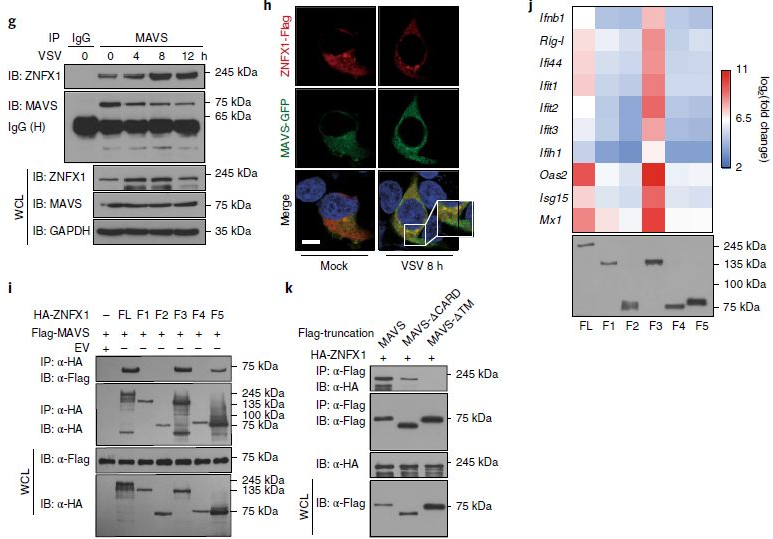 為了進(jìn)一步表征ZNFX1在感測(cè)病毒RNA時(shí)如何轉(zhuǎn)導(dǎo)抗病毒信號(hào),檢查了ZNFX1與涉及IFN產(chǎn)生的配體(包括TRIF、MyD88,MAVS和STING)的相互作用。免疫共沉淀實(shí)驗(yàn)表明,帶有HA標(biāo)記的ZNFX1與帶有Flag標(biāo)記的MAVS相關(guān),但與TRIF、MyD88和STING無關(guān)(圖6d)。免疫沉淀(Co-IP)實(shí)驗(yàn)進(jìn)一步表明,ZNFX1和MAVS在A549細(xì)胞中形成天然復(fù)合物,并且病毒感染后ZNFX1表達(dá)上調(diào)而增強(qiáng)了它們的結(jié)合(圖6e-g)。共聚焦顯微鏡實(shí)驗(yàn)還表明ZNFX1與MAVS共定位(圖6h)。使用一系列ZNFX1截短突變體進(jìn)行進(jìn)一步的免疫沉淀試驗(yàn)表明,全長(zhǎng)ZNFX1和含ARM的突變體,包括F3和F5,都可以與MAVS相互作用(圖6i)。與共免疫沉淀試驗(yàn)一致,ZNFX1的全長(zhǎng)和F3截短突變體過表達(dá)導(dǎo)致了Ifnb1和ISG的誘導(dǎo)表達(dá)以及受限制的VSV復(fù)制(圖6j)。此外,如果沒有跨膜(TM)域,ZNFX1不能與截短的MAVS相互作用(圖6k),ZNFX1的線粒體分布與其與MAVS的相互作用無關(guān)。