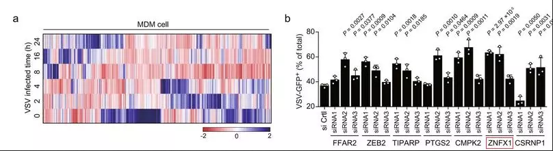 作者首先分析了他們先前發(fā)表的被水皰性口炎病毒(VSV)感染的單核細(xì)胞衍生巨噬細(xì)胞(MDM)的IVT-SAPAS(in vitro transcription-sequencing alternative polyadenylation sites)數(shù)據(jù),并發(fā)現(xiàn)了許多表達(dá)改變的基因。【之前已發(fā)表文章的數(shù)據(jù)重新挖掘】通過比較受VSV感染的人MDM數(shù)據(jù)和小鼠腹膜巨噬細(xì)胞數(shù)據(jù),發(fā)現(xiàn)了一些共同的基因,它們被上調(diào)了三倍以上,包括FFAR2,ZEB2,TIPAP,PTGS2,CMPK2,ZNFX1和CSRNP1。隨后敲除A549細(xì)胞中的這些基因,用VSV-eGFP(VSV-增強(qiáng)型綠色熒光蛋白)感染細(xì)胞,流式細(xì)胞術(shù)檢測(cè)GFP陽(yáng)性細(xì)胞的百分比表明,敲減ZNFX1(其抗病毒作用尚未見報(bào)道)促進(jìn)了VSV感染。