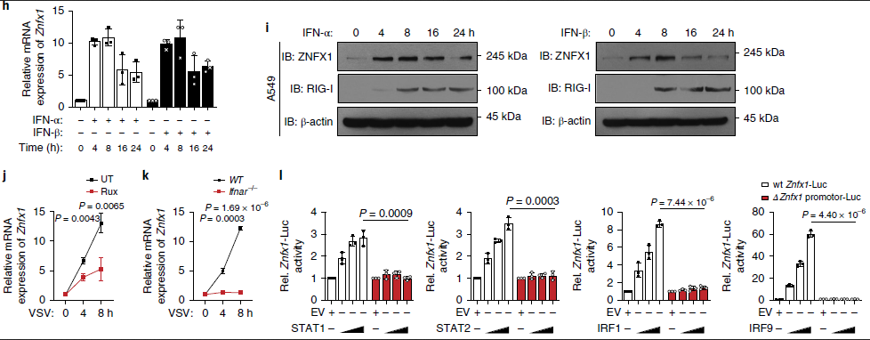 由于病毒感染導(dǎo)致ZNFX1的mRNA和蛋白質(zhì)水平表達(dá)均增強(qiáng),接下來通過將A549細(xì)胞與人重組IFN-α和IFN-β一起孵育來檢測(cè)ZNFX1是否為ISG。qRT-PCR和免疫印跡分析的結(jié)果表明ZNFX1的表達(dá)可以被IFN-α和IFN-β誘導(dǎo)(圖1h,i)。相比之下,JAK1抑制劑魯索替尼(ruxolitinib)可以抑制VSV對(duì)Znfx1 mRNA的誘導(dǎo),并且在Ifnar1-/-A549細(xì)胞中幾乎消失(圖1j,k)。