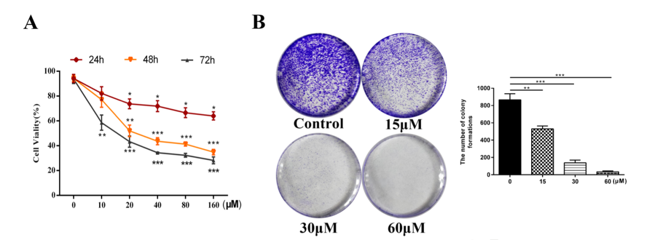 在平板克隆形成試驗(yàn)中,與未經(jīng)處理的對照組相比,經(jīng)不同濃度(15、30和60μM)的α- Cyperone處理的HeLa細(xì)胞形成的集落更少且更小,這表明α- Cyperone以劑量依賴性方式降低HeLa細(xì)胞的集落形成能力(圖1B)