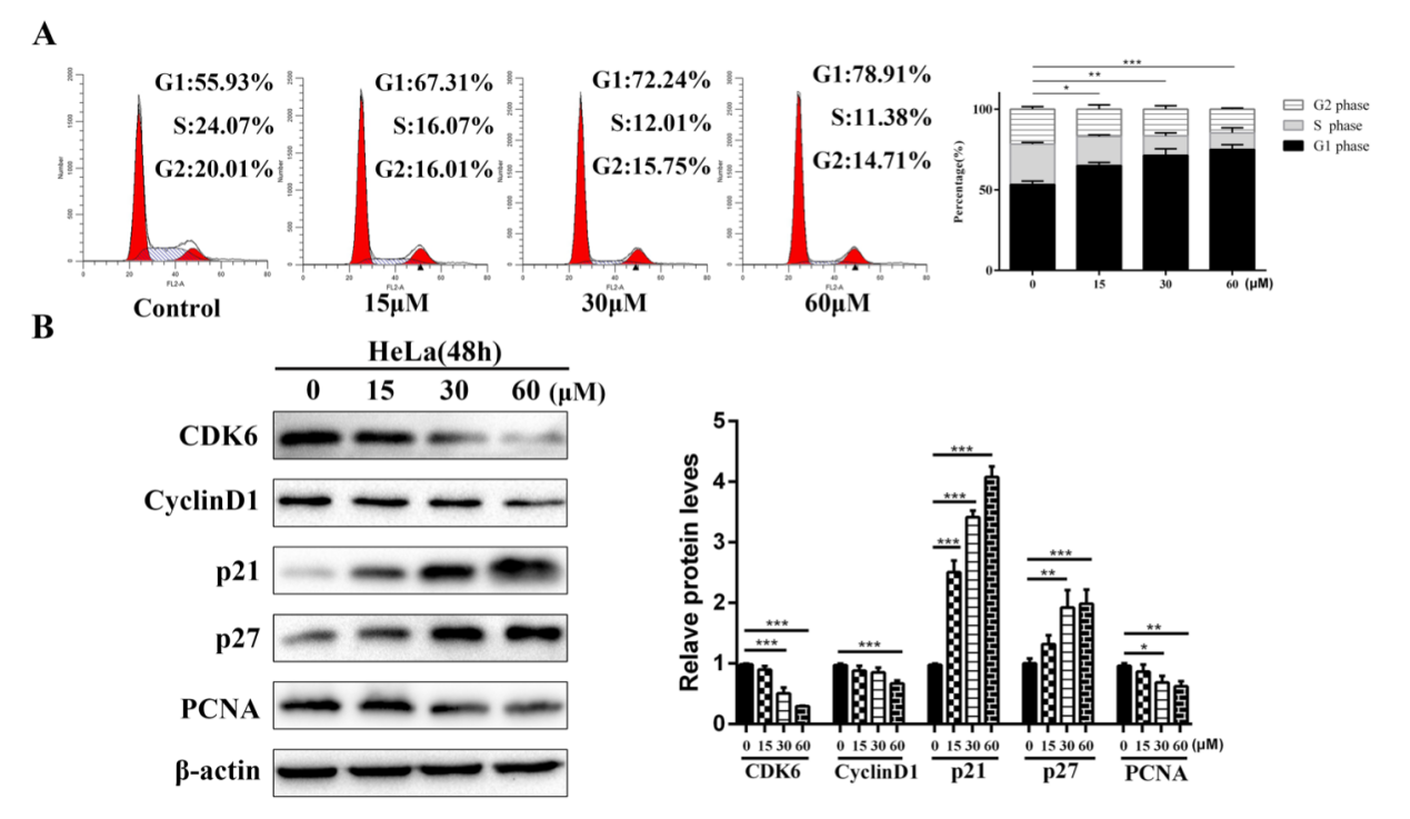 為了研究α-Cyperone是否抑制HeLa細(xì)胞的細(xì)胞周期進(jìn)程,作者用不同濃度(0、15、30和60μM)的α-Cyperone處理細(xì)胞24小時(shí),然后收集細(xì)胞進(jìn)行細(xì)胞周期分析。結(jié)果表明,α-Cyperone處理使G1期細(xì)胞百分率增加,G1期細(xì)胞百分率分別增加6.17%、15.20%和21.30%(圖2A)。采用westernblot檢測cdc25A、cyclind1、CDK6、PCNA、p21和p27的表達(dá)水平,進(jìn)一步探討α-Cyperone對G1細(xì)胞周期阻滯的作用機(jī)制。作者發(fā)現(xiàn)α-Cyperone下調(diào)cdc25A、cyclind1、CDK6和PCNA蛋白水平,同時(shí)上調(diào)p21和p27蛋白表達(dá)(圖2B)。