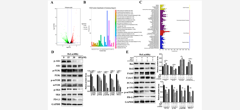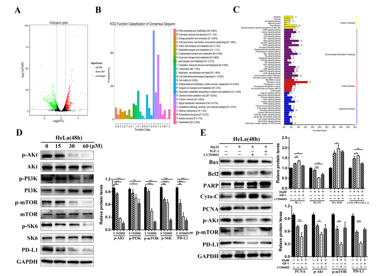 結(jié)果表明,α-Cyperone能抑制HeLa細(xì)胞的增殖并誘導(dǎo)其凋亡。從機(jī)制上講,α-Cyperone通過線粒體凋亡途徑促進(jìn)HeLa細(xì)胞凋亡,細(xì)胞內(nèi)活性氧(ROS)水平升高,細(xì)胞色素c、半胱氨酸蛋白酶-3、PARP和Bax的表達(dá)上調(diào)。進(jìn)一步的RNA測序顯示α-Cyperone抑制HeLa細(xì)胞PI3K/Akt/mTOR信號(hào)通路的激活,PI3K抑制劑和激動(dòng)劑證實(shí)了這一點(diǎn)。PI3K抑制劑(LY294002)與α-Cyperone協(xié)同抑制HeLa細(xì)胞的生長,而PI3K激動(dòng)劑(IGF-1)則消除了這種作用。有趣的是,α-Cyperone和LY294002均能抑制PD-L1的表達(dá),而IGF-1的補(bǔ)充則能挽救PD-L1的低表達(dá)。綜上所述,作者的研究結(jié)果揭示了α-Cyperone對HeLa細(xì)胞生長的抑制作用是通過ROS介導(dǎo)的PI3K/Akt/mTOR信號(hào)通路觸發(fā)的,并且與PD-L1表達(dá)的下降密切相關(guān)。