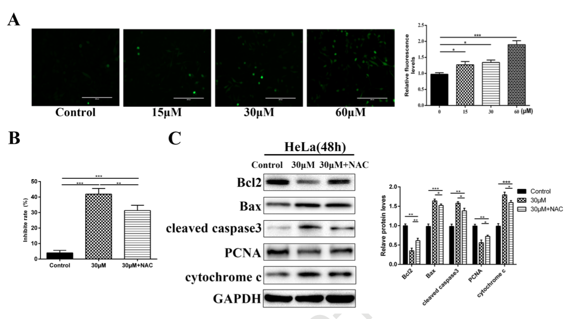 如圖4A所示,在濃度分別為15、30和60μM的α-Cyperone作用48小時(shí)后,Hela細(xì)胞產(chǎn)生的細(xì)胞ROS分別增加到30.12%、37.30%和94.67%。然后,作者進(jìn)一步確定ROS抑制劑(N-乙酰半胱氨酸,NAC)預(yù)處理是否能保護(hù)HeLa細(xì)胞免受α-Cyperone的細(xì)胞毒作用。如4B所示,與α-Cyperone單獨(dú)治療組相比,NAC和α-Cyperone聯(lián)合治療可顯著降低細(xì)胞色素c、Bax的表達(dá),增加PCNA和Bcl-2的表達(dá)。結(jié)果表明,α-Cyperone誘導(dǎo)HeLa細(xì)胞生長抑制是通過破壞氧代謝平衡實(shí)現(xiàn)的。