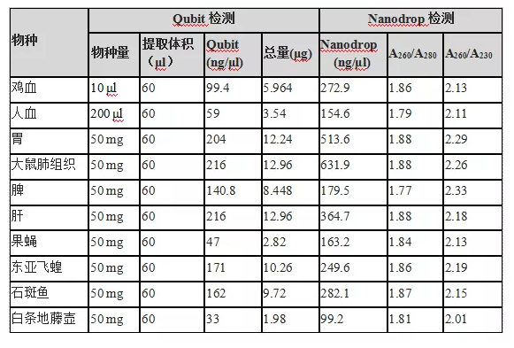 1.DNA濃度/純度檢測:提取不同動物組織中的DNA,然后檢測DNA的濃度和吸光度。