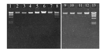 大鼠肺;Lane 6:小鼠脾臟;Lane 7:小鼠肝臟;Lane 8:Marker;Lane 9:果蠅;Lane 10:東亞飛蝗;Lane 11:石斑魚;Lane 12:白條地藤壺;Lane 13:λ-Hind Ⅲ DNA Marker。