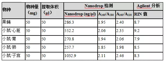 1.RNA濃度檢測:Nanodrop檢測A260/A280值在2.0左右,表明提取的RNA純度高,且濃度高。同時Agilent 2100生物分析儀檢測的RIN值接近10,表明RNA無降解,完整性好。