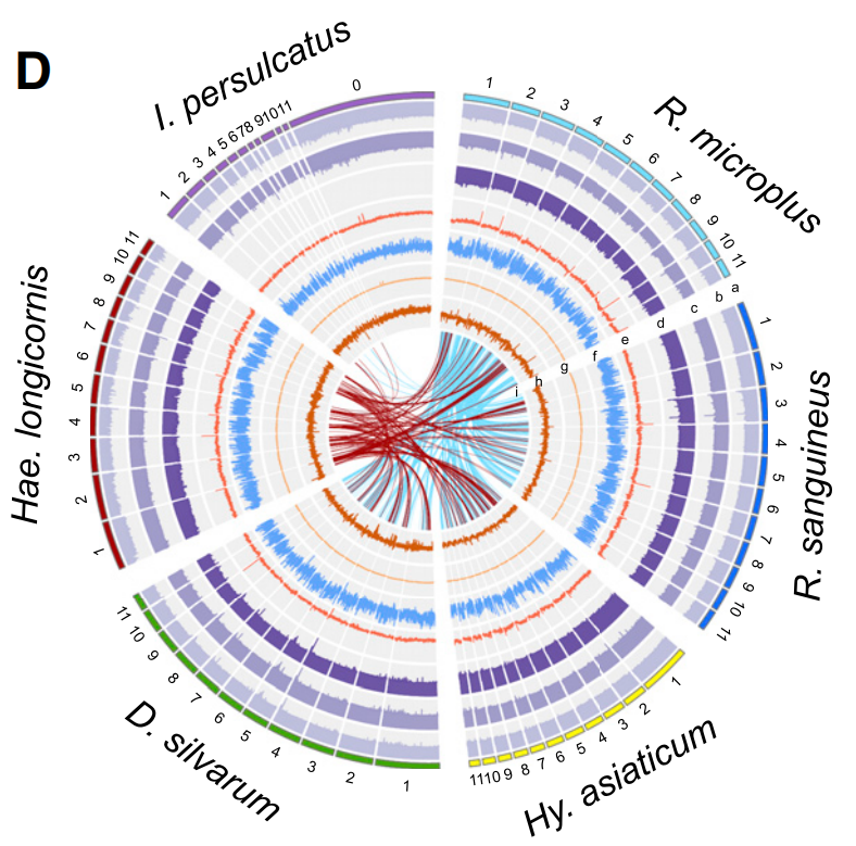 除了上述跨越科水平的譜系基因組研究,其實(shí)還有很多同科內(nèi)不同屬間的動(dòng)物群體基因組。例如通過(guò)構(gòu)建硬蜱科內(nèi)6種蜱蟲(chóng)基因組,解析不同蜱種的演化歷程,揭示了蜱專(zhuān)性吸血的遺傳機(jī)制以及蜱蟲(chóng)遺傳多樣性及分布規(guī)律,并通過(guò)宏基因組學(xué)研究等方式探究了蜱媒病原體的生態(tài)分布和進(jìn)化機(jī)制(Jia N et al., Cell.2020)。