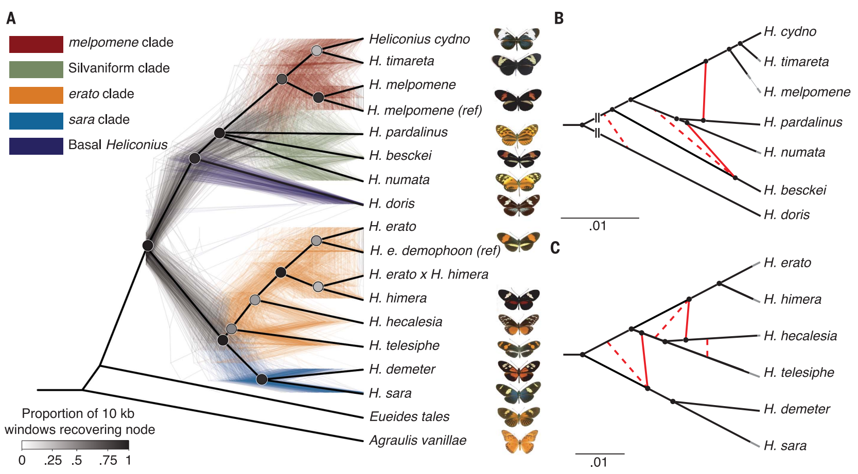 針對(duì)于同一個(gè)屬內(nèi)不同種之間的研究,由于其間親緣關(guān)系相對(duì)較近,基因組間相似度較高,往往是對(duì)其基因結(jié)構(gòu)特征差異、轉(zhuǎn)座子分析、屬內(nèi)分類(lèi)研究、基因組間的基因漸滲現(xiàn)象、大型結(jié)構(gòu)變異挖掘、基因正選擇分析上進(jìn)行。例如,作者通過(guò)構(gòu)建20個(gè)新的袖蝶屬基因組揭示基因滲入和不完全譜系分選的作用(Edelman N B et al.,Science.2020)、通過(guò)15個(gè)亞屬的17種熊蜂基因組確定了關(guān)鍵生態(tài)和取食偏好等行為特征相關(guān)的變異(Sun C et al.,Mol Biol Evol.2020)。