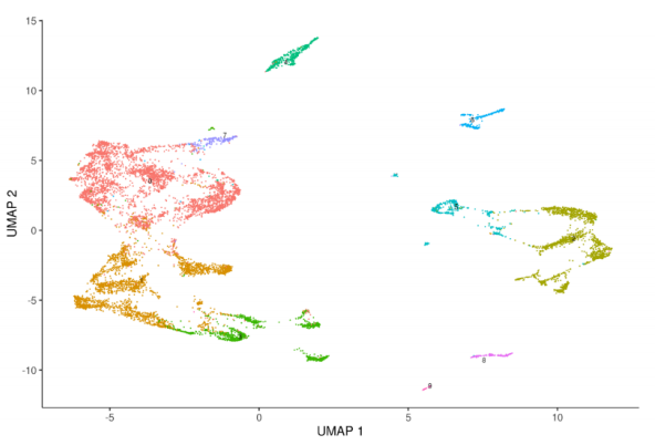 2?plot_cells(monocle_cds,?color_cells_by=”seurat_clusters”)?#?umap顯示原seurat?細胞聚類的結(jié)果