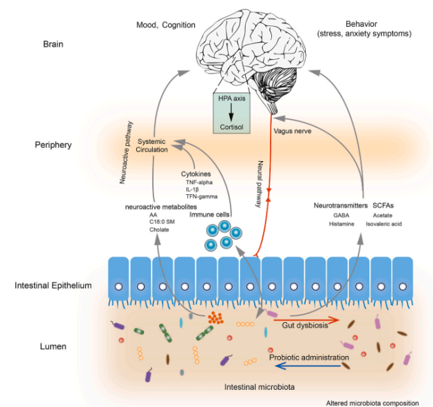 壓力在人們的生活中無處不在,嚴(yán)重的時(shí)候會(huì)引起人類焦慮甚至抑郁。目前抑郁影響著全球3億多人,每年有近80萬人因抑郁自殺身亡。最近的研究已經(jīng)證明壓力會(huì)擾亂人類腸道微生物菌群的平衡,進(jìn)而導(dǎo)致焦慮、抑郁等心理疾病。人類和腸道微生物的基因組溝通進(jìn)化,導(dǎo)致腸道、腸道神經(jīng)系統(tǒng)和中樞神經(jīng)系統(tǒng)之間存在復(fù)雜的互作。腸道菌群參與各種激素、神經(jīng)遞質(zhì)的合成、釋放,其紊亂會(huì)導(dǎo)致壓力、焦慮、抑郁、帕金森疾病和阿爾茲海默癥。人類需要維持腸道微生物菌群平衡,從而保證身體健康。足量的益生菌可以與腸道菌群相互作用,使宿主保持心理健康。在這個(gè)過程中,益生菌調(diào)節(jié)宿主的腸道微生物群落,及某些神經(jīng)活性化合物的合成、釋放。因此提出了基于益生菌治療某些神經(jīng)和神經(jīng)退行性疾病的療法。高質(zhì)量的人類和動(dòng)物相關(guān)研究表明,腸道微生物群在許多與壓力相關(guān)的情況中發(fā)揮著重要作用。然而,腸道微生物組在壓力相關(guān)條件下的因果關(guān)系和貢獻(xiàn)程度尚不清楚,本文旨在從腸道微生物組的角度闡明這種機(jī)制。