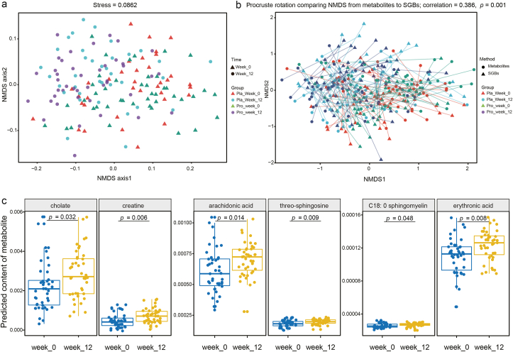 益生菌 (pro) 和安慰劑 (pla) 組在兩個(gè)時(shí)間點(diǎn)的預(yù)測(cè)腸道代謝組之間的差異。(a) 非度量多維標(biāo)度(NMDS,Bray-Curtis 相似性指數(shù))和(b)對(duì)在第 0 周和第 12 周對(duì)兩組受試者的預(yù)測(cè)微生物組和代謝組進(jìn)行了Procrustes 分析,表明顯示微生物組學(xué)和代謝組學(xué)特征之間的正協(xié)同性(correlation = 0.386;P??= 0.001)。(c) 益生菌組第 0 周和第 12 周之間預(yù)測(cè)的差異神經(jīng)活性代謝物。p 值經(jīng) FDR 法校正,閾值 P < 0.05 表示顯著。