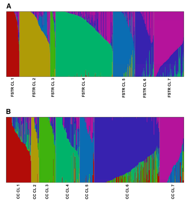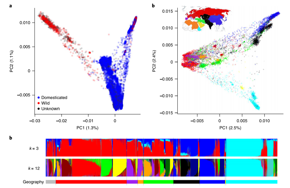 基因庫收集和保存大量植物和詳細(xì)的護(hù)照信息,目的是保護(hù)遺傳多樣性以進(jìn)行保護(hù)和育種。此類集合的遺傳表征有可能闡明重要作物的遺傳歷史,使用標(biāo)記-性狀關(guān)聯(lián)來鑒定感興趣性狀的位點(diǎn),尋找正在進(jìn)行選擇的位點(diǎn),并通過識別分類錯(cuò)配和重復(fù)為基因庫管理作出貢獻(xiàn)。本研究通過GBS測序?qū)碜匀蚧驇斓?0,038個(gè)辣椒 (Capsicum spp.) 種質(zhì)進(jìn)行基因分型,并調(diào)查了這種標(biāo)志性主食的近期歷史?;赟NP數(shù)據(jù)計(jì)算了identity-by-state (IBS) 比例,在基因庫內(nèi)和基因庫之間檢測到多達(dá) 1,618 個(gè)重復(fù)種質(zhì)。進(jìn)一步深入分析了常見食用辣椒的遺傳多樣性以調(diào)查其歷史,發(fā)現(xiàn)在全球廣泛地區(qū)收集的辣椒種類有很大的重疊。GWAS分析和選擇清除分析發(fā)現(xiàn)辣椒性狀,如刺激性,這些性狀在全球分布不均勻,表明人類偏好對馴化辣椒的遺傳結(jié)構(gòu)產(chǎn)生了主要影響。