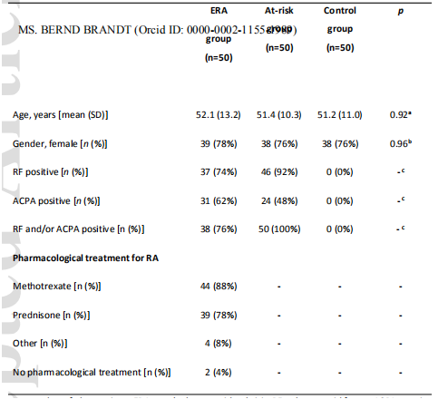 從2017年11月到2019年7月共納入了150名參與者,每組50人(表1)。ERA患者平均在確診為RNA后3.1±1.7個月入選。大部分ERA患者按照國家類風濕關節(jié)炎藥物治療指南采用甲氨蝶呤治療,多與強的松聯(lián)合治療(表1)。