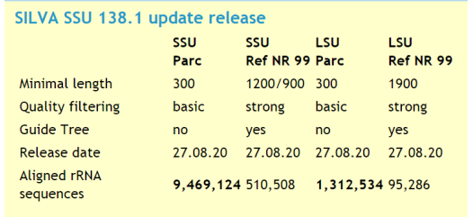 SILVA是一個(gè)包含三域微生物(細(xì)菌、古菌、真核)rRNA基因序列的綜合數(shù)據(jù)庫,其數(shù)據(jù)庫涵蓋了原核和真核微生物的小亞基rRNA基因序列(簡稱SSU,即16S和18SrRNA)和大亞基rRNA基因序列(簡稱LSU,即23S和28SrRNA)。目前數(shù)據(jù)庫版本為SILVA 138.1,更新時(shí)間為2020年9月2日,數(shù)據(jù)庫包含的數(shù)據(jù)信息見下表1所示。