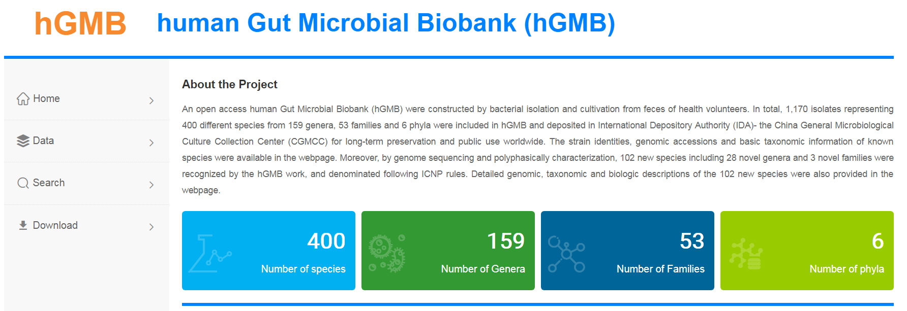 2021年5月,中科院微生物所通過從健康志愿者糞便中分離培養(yǎng)細(xì)菌,構(gòu)建了一個(gè)開放獲取的人類腸道微生物庫(hGMB)。數(shù)據(jù)庫共有1170個(gè)菌株,代表6門53科159屬400個(gè)不同物種。并保存在國際保存機(jī)構(gòu)(IDA)-中國微生物培養(yǎng)總收集中心(CGMCC),以便在全球范圍內(nèi)長期保存和公共使用。該網(wǎng)站提供了已知物種的菌株身份、基因組材料和基本分類信息。根據(jù)國際原核生物命名規(guī)則,對(duì)102個(gè)新種進(jìn)行了特征描述和命名,提出了28個(gè)新屬和3個(gè)新科。hGMB代表了全球人類腸道16S rRNA基因擴(kuò)增子數(shù)據(jù)(n=11647)中80%以上的常見和優(yōu)勢人類腸道微生物屬和種。
