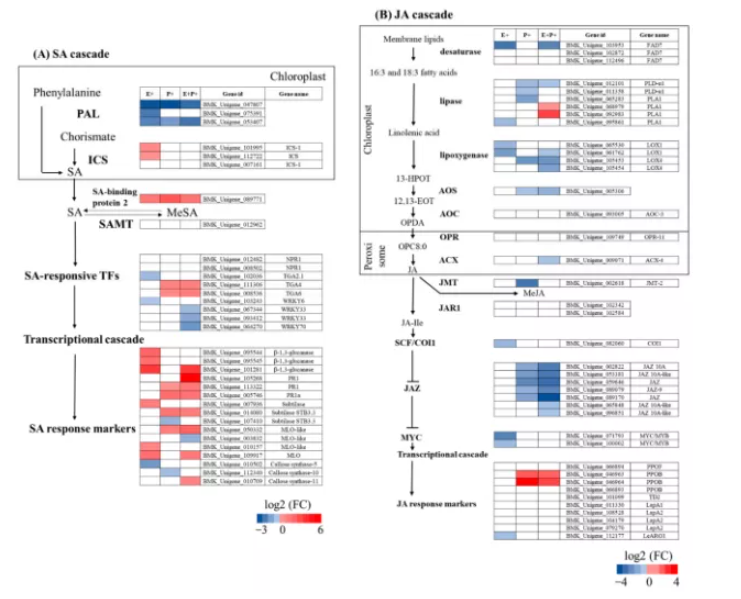 分析不同處理下,與JA和SA生物合成和反應(yīng)途徑相關(guān)的DEGs。發(fā)現(xiàn)了12個(gè)參與α-亞麻酸代謝和JA介導(dǎo)的信號(hào)通路的基因和4個(gè)參與苯丙氨酸和SA介導(dǎo)的信號(hào)通路的基因。JA和SA生物合成和反應(yīng)途徑的關(guān)鍵基因,如LOX2S、AOS、OPR、ACX、JMT、JAZ、PAL、NPR1、TGA和PR-1,表現(xiàn)出不同程度的上調(diào)或下調(diào)。