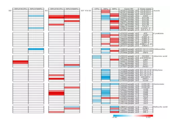 根據(jù)不同處理下的分析,我們共發(fā)現(xiàn)了 51 個(gè)與激素生物合成和反應(yīng)途徑相關(guān)的 DEG。包括12個(gè)IAA相關(guān)基因、8個(gè)CTK相關(guān)基因、3個(gè)GA相關(guān)基因、7個(gè)ABA相關(guān)基因、7個(gè)ET相關(guān)基因、12個(gè)JA相關(guān)基因和4個(gè)SA相關(guān)基因。