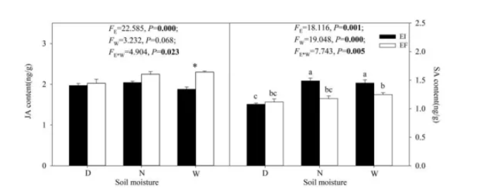 內(nèi)生真菌的存在與否,醉馬草內(nèi)生真菌相互作用對(duì)JA和SA均有含量有顯著影響。在60% 土壤水分含量下,醉馬草JA 含量EF顯著高于 EI。在 EI 或 EF 植物中,土壤水分含量對(duì) JA 含量沒(méi)有顯著影響。對(duì)于 EI 植物,三種土壤含水量處理的 JA 水平同樣低。對(duì)于 EF 植物,只有在 15% 的土壤水分含量時(shí),JA 水平與 EI 植物一樣低。在 30% 和 60% 的土壤水分含量下,醉馬草EF的SA含量顯著高于EI。醉馬草EI在30%和60% 土壤水分含量下的 SA 含量顯著高于15%土壤水分含量。