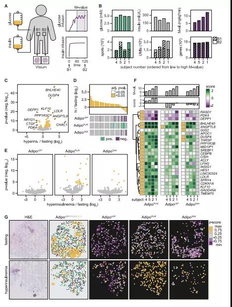 ? ? ? ??在脂肪細(xì)胞中,兒茶酚胺刺激脂肪分解,胰島素抑制脂肪分解促進(jìn)脂肪生成。通過校正BMI(圖6c),作者觀察到AdipoPLIN和兩種脂解指標(biāo)之間存在正相關(guān),而AdipoLEP與這些參數(shù)沒有或弱負(fù)相關(guān)。對于胰島素刺激脂肪生成,研究發(fā)現(xiàn)Adipo PLIN與此指標(biāo)呈正相關(guān),AdipoLEP呈負(fù)相關(guān)。相比之下,AdipoSAA與任何研究參數(shù)均無顯著相關(guān)性??傊?,這表明Adipo PLIN與AdipoSAA相比,Adipo PLIN與更明顯的胰島素反應(yīng)有關(guān)。為了在人體內(nèi)測試這一發(fā)現(xiàn),作者在高胰島素-微生物-正血糖鉗夾2小時后,從10個個體中的4個收集了 WAT樣本,并進(jìn)行了空間轉(zhuǎn)錄組分析(圖7A,7B)。穩(wěn)定狀態(tài)下的胰島素平均濃度是空腹?fàn)顟B(tài)下的10倍,從葡萄糖處理率(m值)可以看出,4例患者均表現(xiàn)出明顯的胰島素敏感性(圖7B)。高胰島素血癥的空間數(shù)據(jù)與禁食狀態(tài)下獲得的樣本質(zhì)量相似(圖7B),兩者的比較在基因表達(dá)水平上明確了胰島素反應(yīng)(圖7C)。這些數(shù)據(jù)與之前報道的高胰島素鉗夾隊(duì)列的大量組織RNA測序顯示出一致的結(jié)果,表明空間分析捕捉到了胰島素的急性反應(yīng)。盡管胰島素誘導(dǎo)了一個快速的轉(zhuǎn)錄反應(yīng),但在這個時間框架內(nèi),它本身并不是脂肪細(xì)胞異質(zhì)性的驅(qū)動因素(圖7D)。接下來,作者根據(jù)細(xì)胞類型進(jìn)行胰島素反應(yīng)分析。對于脂肪細(xì)胞,在AdipoPLIN中有多個基因?qū)σ葝u素有顯著反應(yīng),AdipoSAA中變少,而AdipoLEP中只有一個基因(圖7E)。作者評估了個體間對胰島素的轉(zhuǎn)錄反應(yīng)是否存在數(shù)量差異,分析結(jié)果表明,Adipo PLIN反映了 M-values值,但這在其他兩個亞型中不明顯(圖7F和7G)??傊?,這些數(shù)據(jù)表明,體內(nèi)對胰島素的轉(zhuǎn)錄反應(yīng)主要?dú)w因于Adipo PLIN,而其他脂肪細(xì)胞亞型對高胰島素血癥仍然沒有反應(yīng)。