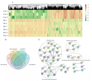 為了探討針刺治療心肌梗死的機(jī)制,作者利用納米孔完成了不同組的基因表達(dá)檢測。RNA-seq結(jié)果顯示,與對照組相比,MI組有5083個(gè)差異表達(dá)基因,PC6組與MI組相比有324個(gè)差異表達(dá)基因。通過聚類分析將對照組、MI組和PC6組中上調(diào)和下調(diào)基因制作熱圖和維恩圖,發(fā)現(xiàn)MI組2773個(gè)差異基因上調(diào),針刺治療下調(diào)了其中的65個(gè)差異基因,同時(shí),在MI組的2308個(gè)下調(diào)的差異基因中,針刺治療可逆轉(zhuǎn)19個(gè)差異基因的表達(dá)。作者推測這84個(gè)差異基因可能是針刺抗心肌缺血作用的關(guān)鍵靶點(diǎn)?;赟TRING數(shù)據(jù)庫對MI和PC6共同調(diào)控的差異基因進(jìn)行蛋白-蛋白相互作用(PPI)網(wǎng)絡(luò)分析。結(jié)果表明,蛋白質(zhì)主要富集了4類,主要包括:炎癥反應(yīng),肌動(dòng)蛋白細(xì)胞骨架的調(diào)節(jié),I型干擾素介導(dǎo)的信號通路,以及RNA聚合酶II基因DNA在核外周的轉(zhuǎn)錄依賴鏈。