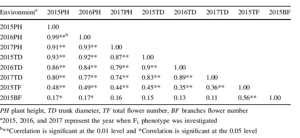 在2015-2017年,對(duì)F1群體的4個(gè)表型性狀進(jìn)行了評(píng)估,其中,PH是通過用尺子測量從地面到樹冠頂部的方式來調(diào)查;TD是記錄移接處上方10cm的直徑;TF和BF是計(jì)算總花數(shù)和分支花數(shù)。此外,相關(guān)性分析顯示,PH和TD呈顯著正相關(guān)(r>0.74, p<0.01)。