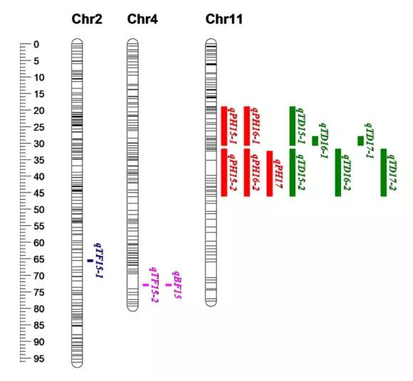為了檢測F1群體中與4個(gè)性狀相關(guān)的位點(diǎn),對(duì)其進(jìn)行QTL分析。對(duì)于PH,結(jié)合3年的表型,在11號(hào)染色體上共鑒定到5個(gè)QTLs(qPH15-1, qPH16-1, qPH15-2, qPH16-2和qPH17),這些QTLs對(duì)表型變異的解釋范圍為17.20% ~ 22.40%。對(duì)于TD,共定位到6個(gè)QTLs(qTD15-1, qTD16-1, qTD17-1, qTD15-2, qTD16-2和qTD17-2),均位于11號(hào)染色體上,對(duì)表型變異解釋范圍為14.00~20.80%,PH與TD定位結(jié)果相重疊,均位于兩個(gè)QTL簇,該結(jié)果進(jìn)一步證實(shí)了PH和TD在表型上呈顯著正相關(guān)。對(duì)TF,定位到2個(gè)QTLs(qTF15-1和qTF15-2),分別位于2和4號(hào)染色體上,解釋表型變異率分別為8.80%和9.20%;另外,還定位到1個(gè)BF相關(guān)的QTL qBF15,可以解釋34.80%的表型變異。qTF15-2和qBF15在4號(hào)染色體被定位到同一個(gè)染色體區(qū)間內(nèi)。
