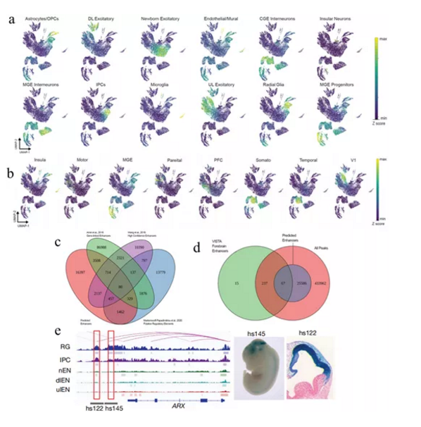 為了鑒定候選增強(qiáng)子,整合了ATAC-seq、CUT&Tag、Hic和基因表達(dá)數(shù)據(jù),并使用接觸活性算法來(lái)預(yù)測(cè)所有類(lèi)型的皮質(zhì)細(xì)胞的增強(qiáng)子-基因相互作用。共預(yù)測(cè)了25,659個(gè)基因連鎖增強(qiáng)子。其中在發(fā)育中的人皮層分離的細(xì)胞上進(jìn)行了染色質(zhì)免疫沉淀和測(cè)序(PLAC-seq),發(fā)現(xiàn)了67,493個(gè)開(kāi)放區(qū)以及10,050個(gè)預(yù)測(cè)的增強(qiáng)子,這些開(kāi)放區(qū)和預(yù)測(cè)的增強(qiáng)子與預(yù)測(cè)的細(xì)胞類(lèi)型特異性增強(qiáng)子相關(guān)的基因被富集。為了進(jìn)一步驗(yàn)證注釋的z確性,將開(kāi)放區(qū)與從人類(lèi)皮質(zhì)組織樣本生成的公開(kāi)可用數(shù)據(jù)進(jìn)行關(guān)聯(lián)分析。發(fā)現(xiàn)scATAC-seq鑒定到了混合測(cè)序數(shù)據(jù)注釋的大多數(shù)開(kāi)放區(qū),并且還鑒定了許多在混合數(shù)據(jù)中未預(yù)測(cè)的細(xì)胞類(lèi)型特異性peaks,特別是富集在諸如小神經(jīng)膠質(zhì)細(xì)胞和內(nèi)皮細(xì)胞的稀有細(xì)胞群體中的開(kāi)放區(qū)。在功能驗(yàn)證的前腦增強(qiáng)子中,大多數(shù)(319個(gè)中的304個(gè))與染色質(zhì)可及性開(kāi)放區(qū)重疊,但只有67個(gè)重疊的增強(qiáng)子是通過(guò)激活接觸方法進(jìn)行預(yù)測(cè)??傊@些分析表明,scATAC-seq是一種從異質(zhì)組織樣本中檢測(cè)染色質(zhì)可及性模式的可靠方法。然而,預(yù)測(cè)的增強(qiáng)子與以前發(fā)表的研究的有限重疊表明,迫切需要更好地理解預(yù)測(cè)調(diào)控潛力的計(jì)算機(jī)算法的相關(guān)特征。