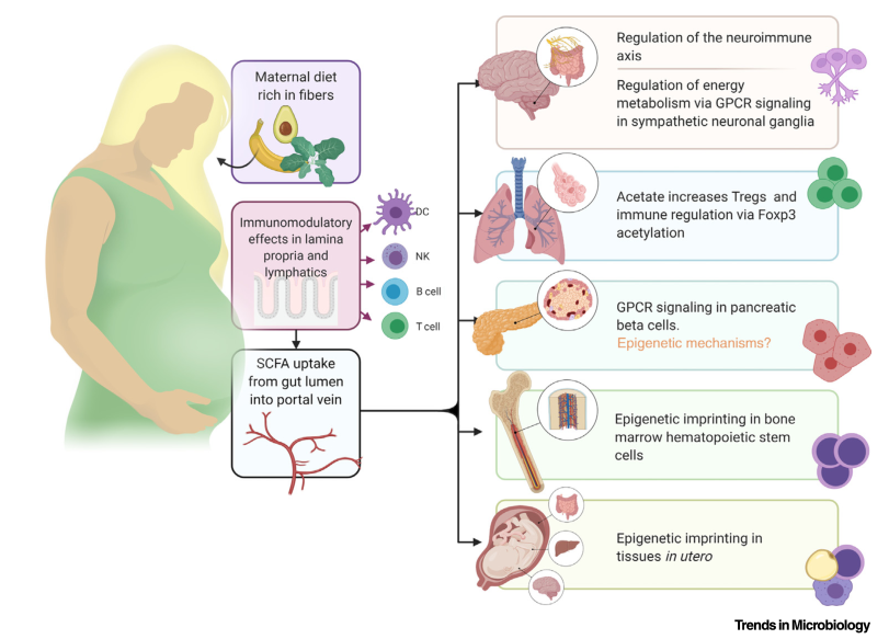 圖1.短鏈脂肪酸(SCFA)對(duì)腸道以外的器官和組織的影響,包括發(fā)育中的胎兒。富含不可消化纖維的飲食可促進(jìn)微生物發(fā)酵和結(jié)腸中SCFA的產(chǎn)生,從而通過直接作用于腸道上皮細(xì)胞和免疫細(xì)胞來促進(jìn)粘膜動(dòng)態(tài)平衡。[2]