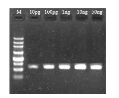 圖4:使用Biomarker HS DNA聚合酶,以不同模板量(10 pg、100 pg、1 ng、10 ng、500 ng)人基因組DNA為模板,擴(kuò)增 628 bp的目的片段,發(fā)現(xiàn)不同模板量都可有效擴(kuò)增。M:250 bp DNA Marker。