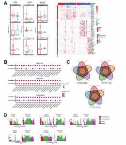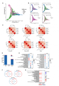 首先基于所有細胞的轉(zhuǎn)錄組學(xué)特性構(gòu)建了一個導(dǎo)向圖(SPRING),所有細胞分為三個分支:EPI、HYP和TE(圖 2A),明確了嵌合體和對照(人和食蟹猴)胚胎之間基因表達模式的相關(guān)性(圖 2B)。當(dāng)嵌合人類細胞與對照人類(0.460)或?qū)φ帐承泛铮?.459)細胞進行比較時,獲得了類似的相關(guān)系數(shù)(圖 2B,右圖),但與對照胚胎相比,嵌合猴細胞的相關(guān)系數(shù)高于嵌合人類細胞(圖 2B,左圖);接下來發(fā)現(xiàn)嵌合人EPI-like細胞與人胚胎中的EPI細胞相似,而嵌合人HYP和EXMC-like細胞分別與嵌合猴HYP和EXMCs細胞相關(guān)系數(shù)最高(圖 2C)。同時發(fā)現(xiàn)嵌合人類EPI-like細胞逐漸傾向于嵌合猴EPI細胞,R2值從0.363(植入前EPI [Pre_EPI])增加到0.464(植入后EPI [PostL_EPI]),再增加到0.693(原腸[Gast]細胞)(圖 2C)。以上結(jié)果表明猴胚胎微環(huán)境對人類細胞的基因轉(zhuǎn)錄狀態(tài)產(chǎn)生影響,反之亦然。