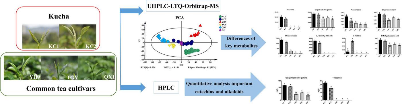 研究結(jié)果:采用非靶向代謝組學方法,研究了苦茶的代謝物。結(jié)果表明,2個苦茶品種與3個對照普通茶品種之間共鑒定出90種差異代謝物。其中,茶苦堿等8種代謝物在KC1和KC2中的含量均顯著高于對照品種。這些化合物中的大多數(shù)都是導致苦茶苦味的重要因素?;诟咝б合嗌V的定量分析結(jié)果與LC-MS分析結(jié)果相似,表明苦茶中茶苦堿和EGCG含量高于對照品種。此外,研究數(shù)據(jù)還表明,苦茶的強烈苦味可能是兒茶素、生物堿、黃酮醇和黃酮醇/黃酮苷、氨基酸和酚酸的綜合作用的結(jié)果。為進一步研究苦茶的苦味和營養(yǎng)特性提供了理論依據(jù)。