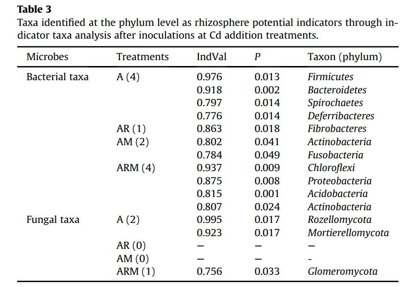 表3 通過添加Cd處理后的指示性類群分析,在門類水平將分類群確定為根際潛在指標(biāo)。
