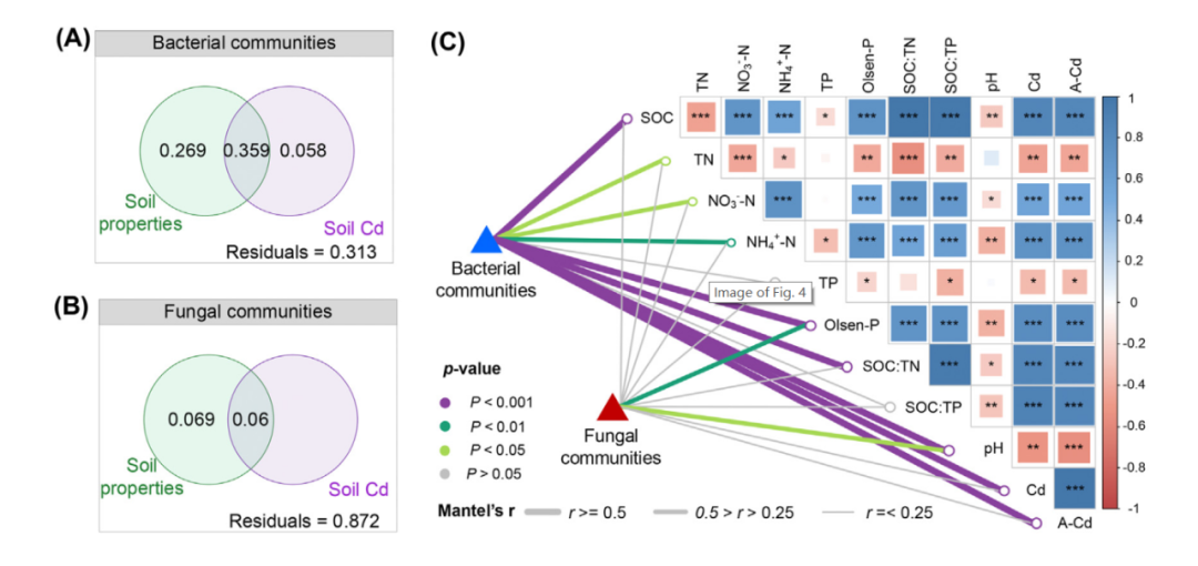 圖4 變異分區(qū)分析顯示了細(xì)菌(A)和真菌(B)群落解釋的土壤特性和土壤Cd的差異百分比。土壤變量與微生物群落結(jié)構(gòu)之間的關(guān)系(C)。細(xì)菌類群(門水平,D)和真菌類群(門水平,E)與土壤特性的相關(guān)熱圖。