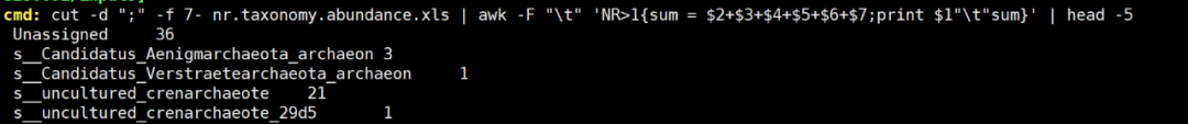 cut -d “;” -f 7- nr.taxonomy.abundance.xls | awk -F “\t” ‘NR>1{sum = $2+$3+$4+$5+$6+$7;print $1″\t”sum}’ | head -5 #計算各個種在所有樣本種的豐度之和,展示前5行。