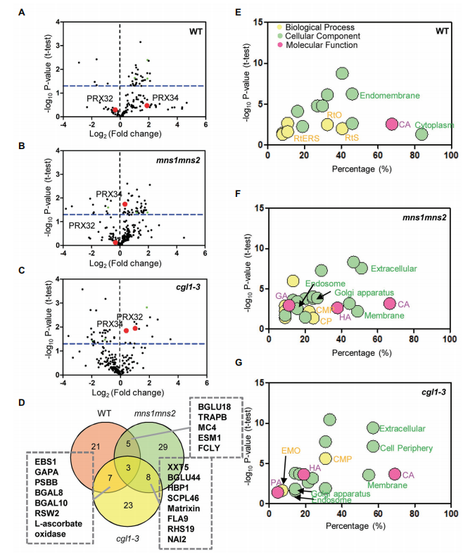 文中進一步分析了鹽脅迫下DAG在GO注釋和KEGG代謝途徑中的生物學功能。在兩個突變體中觀察到更多減少的糖蛋白,尤其是在cgl1-3中(圖2?A–C)。值得注意的是,與?WT?相比,?mns1?mns2和cgl1-3突變體中的水解酶均得到富集(圖2?D–F)。在鹽脅迫下,WT和兩個參與內質網聚糖鏈轉移的突變體中?STT3A(OST亞基)、紫色酸性磷酸酶?2(PAP2)和類胚蛋白10(GLP10)的豐度發(fā)生了變化,這些蛋白分別參與了根系生長和碳代謝(圖2?D)。STT3A在?WT中增加,但在mns1?mns2和cgl1-3中減少;PAP2?在?WT?和mns1mns2中增加,但在cgl1-3中減少,并且GLP10在所有三個樣本中都增加。進一步的分子功能分析發(fā)現(xiàn),與WT相比,水解酶活性在mns1?mns2和cgl1-3中富集(圖2?E,G)。WT中鑒定的蛋白質的生物學過程多與應激反應相關,而來自突變體的大多數(shù)DAG與碳水化合物代謝過程有關(圖3?G)。這些結果表明,mns1?mns2和cgl1-3突變體中的鹽響應糖蛋白不能正確響應壓力,這可能是由于缺乏正確的N-聚糖修飾,導致它們的亞細胞定位異常。